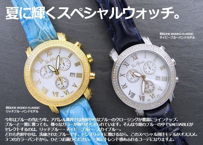 Joe Rodeo時計イエローゴールドブルーモデル再入荷いたしました。 2014年10月16日 joe Rodeo時計イエローゴールドブルーモデル再入荷いたしました。 ジョーロデオシリーズの中でも、クラシックウォッチは、非常に男性らしいモデル。 あえてフェイスには、シンプルなシェルフェイスに、ローマ数字インディックスと、大人な顔つき。 そこに、ベゼルとラグのダイヤモンドが輝きとてもリッチなたたずまいを約束するセンス良いモデル。 大人仕立てのこの時計にブルーのバンドを加えるのは、リッチかつコーディネートのさし色として秀逸。 控えめな中に品の良さを薫らせるのが高級感といえます。 «前 次» TOPICS